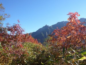 ナナカマドの紅葉の間から槍ヶ岳も見えました。