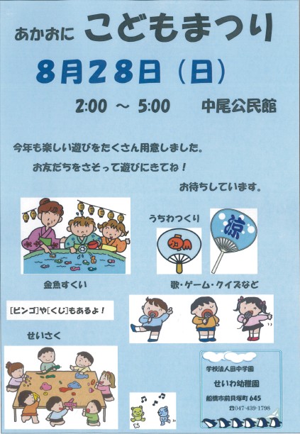 イベント情報 2011.08.24 8/28 赤鬼子供祭り 今年も恒例の 「あかおに こどもまつり」 が 8月28日14:00~17:00 中尾公民館で行なわれます。金魚すくいうちわつくり「ビンゴ」や「くじ」歌・ゲーム・クイズなど Tweet Share イベント情報