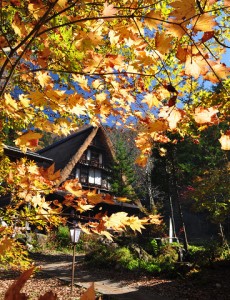 秋の平湯民俗館です。五箇山から移築された合掌造りの建物があります。