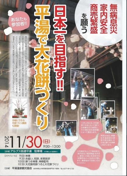 平湯温泉では、高さ4mの大きな花餅を作り、