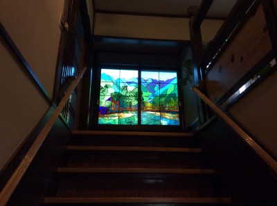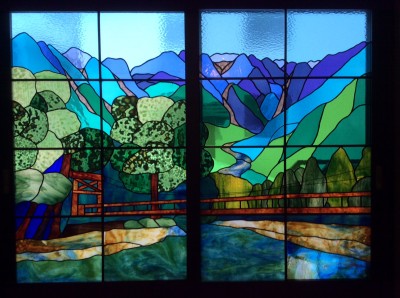 構想から4年目で、当館の2階窓に「上高地」のステンドグラスを飾りました。