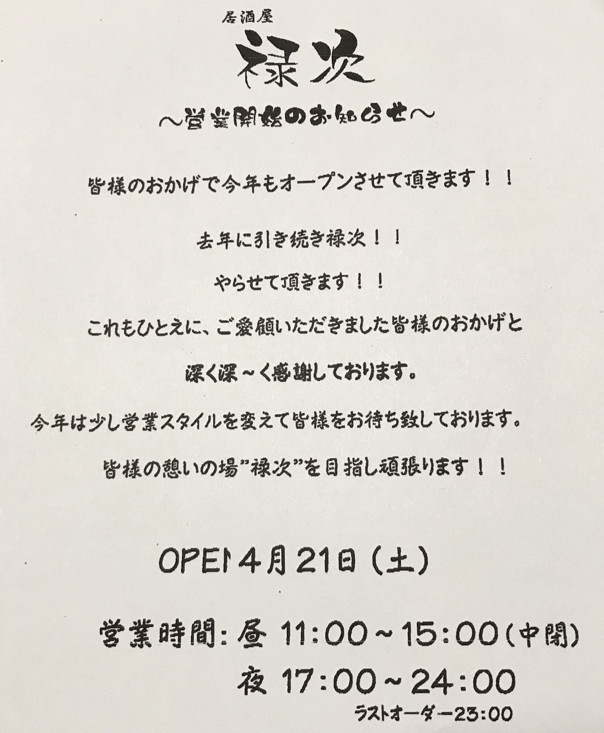 平湯民俗館にあります居酒屋「禄次」が営業を再開します。
