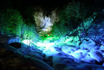 From February 15 to 25 every year, the frozen Hirayu Grand Waterfall is illuminated. This 64-meter high and 6-meter wide waterfall shows its majestic shape with massive ice blocks heaped on top of others.