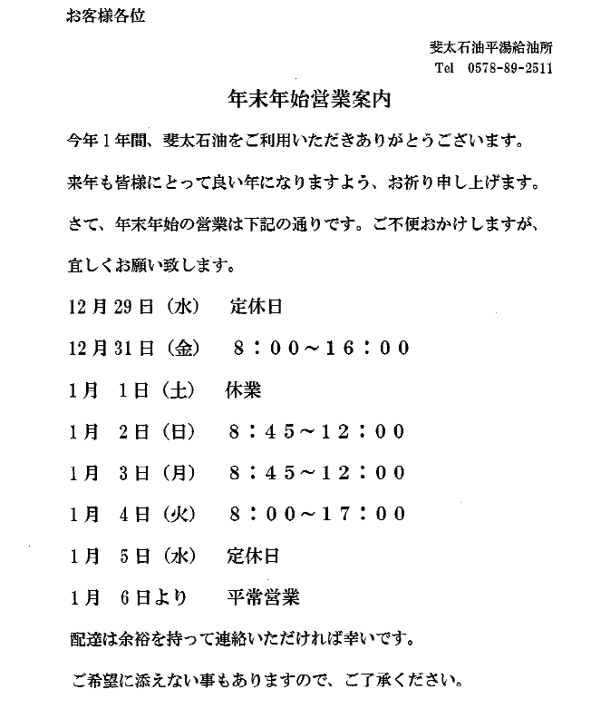 歳時記 2021.12.25 20211229~20220106平湯給油所 営業カレンダー 当館より車で2分の奥飛騨給油所の年末年始営業予定です。 奥飛騨温泉郷にはガソリンスタンドが1軒しかありません。 給油は早めにお願いします。 Tweet Share 歳時記