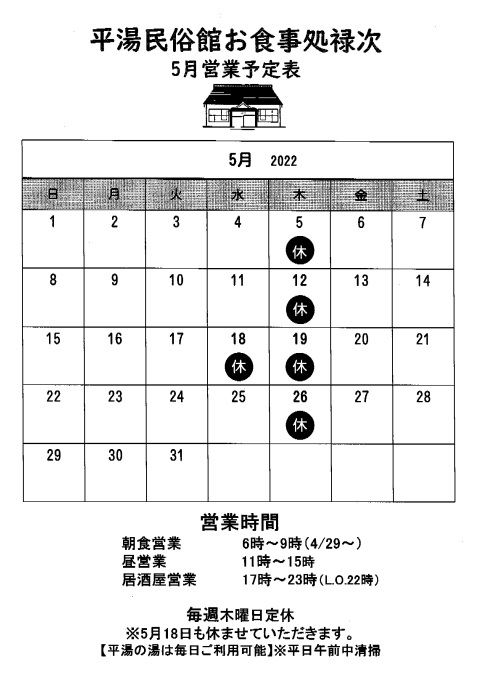 周辺お食事処・Near the cafeteria 2022.05.08 2022年5月 禄次営業予定 当館より徒歩5分、平湯民俗館 奥の お食事処 禄次 の営業予定表です。 どうぞご利用ください。岐阜旅コイン、平湯LINEクーポン利用できます。 Tweet Share 周辺お食事処・Near the cafeteria