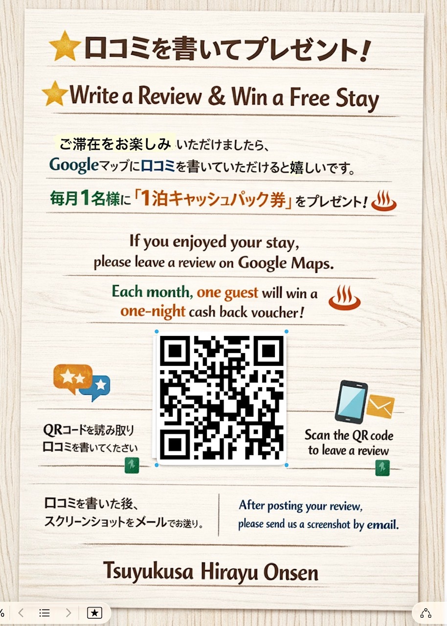 嬉しい口コミを書いていただいたお客様の中から、毎月1名様を抽選で無料宿泊特典をプレゼントしています。